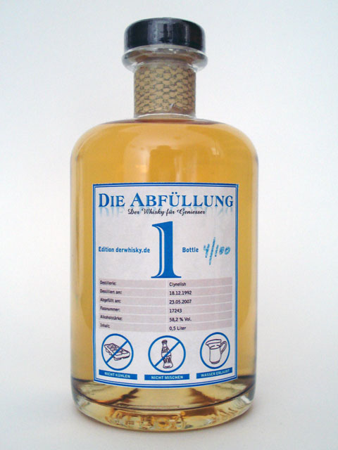 Es handelt sich dabei um 100 Flaschen à 0,5 Liter eines Clynelish aus Fass 17243, destilliert am 18.12.1992, abgefüllt am 23.05.2007 mit 58,2 % Vol. Die Abfüllung stammt von Signatory, trägt aber ein eigenes Label, das von mir gestaltet wurde.