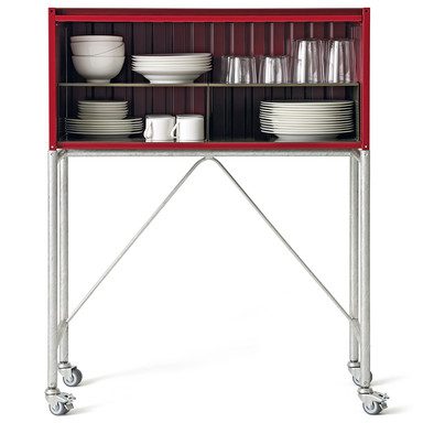 Dem wäre eigentlich nichts hinzuzufügen, hätte ich im Katalog nicht noch etwas anderes entdeckt. An einigen Standorten findet sich neben Manufactum auch der Designmöbel-Anbieter Magazin, bei dem sich immer wieder ausgefallene Ideen finden lassen. Zum Beispiel der Container DS, ein Schrankmöbel in Gestalt eines geschrumpften Überseecontainers. Das Ganze gibt es in verschiedenen Farben, mit unterschiedlicher Einteilung sowie mit Gestellen in diversen Höhen, mit und ohne Rollen. In der nebenstehenden Konfiguration (wenn auch vielleicht nicht in der Farbe) ergibt das eine perfekte rollende Bar. Im knapp 40 cm hohen Container lassen sich Flaschen und Gläser unterbringen, unter das Gestell lassen sich zwei Hocker schieben und obendrauf lässt sich in knapp 1 m Höhe alles abstellen und genießen. Sieht super aus, oder?