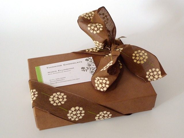 Urheberin dieser ungewöhnlichen Kreation ist die Schottin Nadia Ellingham aus Edinburgh mit Ihrer kleinen Firma Thinking Chocolate. Nachdem sie die Einwohner der schottischen Hauptstadt schon mit vielen anderen handgemachten Schokoladen beglückt hatte, kam sie auf die Idee, dem schottischen Nationalgericht Haggis eine Schokolade zu widmen. Das wollte ich natürlich probieren und habe ihr im Vorfeld meiner Großbritannien-Rundreise Ende Juni eine E‑Mail geschrieben, da die Schokolade nur in kleinen Mengen auf Bestellung gefertigt wird und nicht in den lokalen Shops erhältlich ist. Als ich dann am 1. Juli in Edinburgh war und abends ins Hotel zurück kam, lag auf meinem Zimmer eine sehr nett verpackte kleine Schachtel (siehe Foto). Das nenne ich Service 🙂