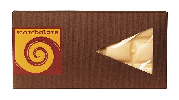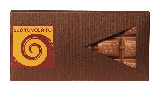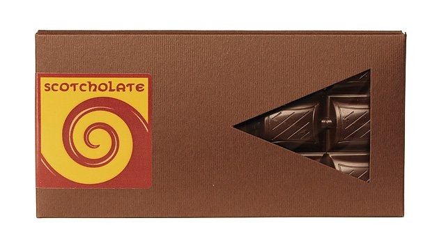 Verkauft werden die Scotcholaden als 90g-Tafelschokoladen, verpackt in Zellophanhülle und eingeschoben in eine elegante, schokoladenbraune Kartonage mit dreieckigem Fenster.