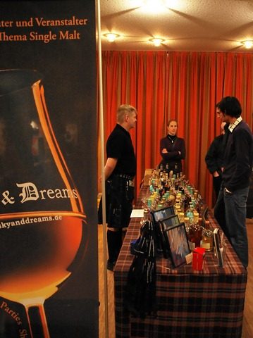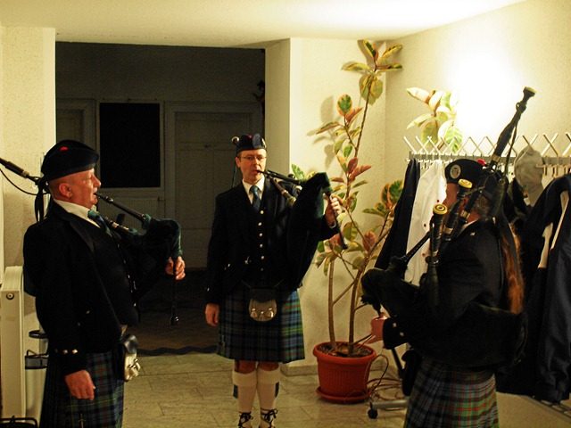 Im Haus der Vereine am Bahnhof begrüßten einen gut hörbar drei Pipers, im Untergeschoss waren Bar und Verkaufsstand aufgebaut. Man konnte sich also schon mal gut aufwärmen und an den vielen Tischen gemütlich zusammen sitzen. Die Gästeschar war bunt gemischt, darunter viele bekannte Gesichter aus den einschlägigen Foren.