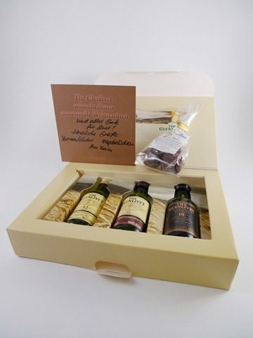 Ein paar Tage vor Weihnachten brachte der Postbote ein Paket, das ich gar nicht bestellt hatte. Absender war Pernod Ricard Deutschland, was schon mal vielversprechend klang. Der Inhalt: Eine Schachtel mit drei Minis von The Glenlivet, 12, 15 und 18 Jahre alt, eine kleine Tüte mit drei kleinen Schoko-Trüffeln von Rausch, eine nette Grußkarte sowie ein Booklet, das unter dem Titel „Whisky & Schoklade“ Genuss in Vollendung versprach. Eine nette Überraschung! 🙂