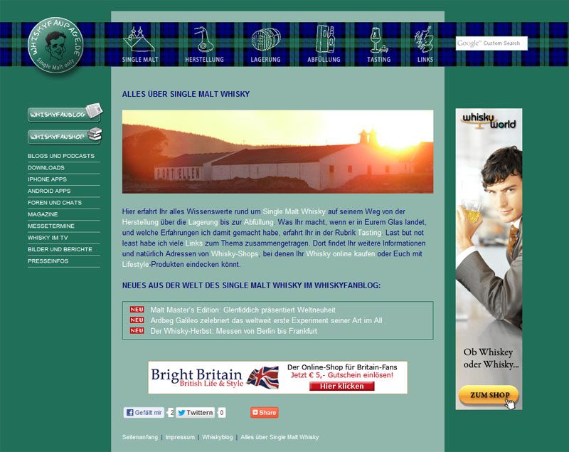 Eigentlich wollte ich ja nur eine Art Linkliste zum Thema machen, weil Infos (zumal auf Deutsch), damals schwer zu finden waren. Herausgekommen ist dann doch ein bisschen mehr und im Laufe der Jahre wurde sie immer wieder erweitert. Seit es das WHISKYFANBLOG in seiner heutigen Form gibt (immerhin auch schon 6 Jahre!) hat sich mein Fokus zwar langsam aber sicher verschoben, aber an den Besucherzahlen und auch den Reaktionen der Leute merke ich, dass die Inhalte der WHISKYFANPAGE immer noch ihren Zweck erfüllen. Zumindest die Liste der Online-Shops wird laufend erweitert (und auch Links angefragt!) und natürlich erfreuen sich auch die immer aktuellen Termine der wichtigsten Whisky-Messen weiterhin großer Beliebtheit. Das findet übrigens auch Google und so steht die WHISKYFANPAGE unter den wichtigsten Keywords seit Jahren auf der ersten Seite der Suchergebnisse.