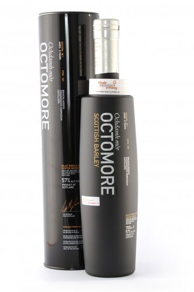 Octomore ist die Bezeichnung für besonders torfige Abfüllungen von Bruichladdich. Der Octomore hält dabei den Rekord für den torfigsten Whisky überhaupt mit 167 ppm (Parts per Million an Phenol am Malz – zum Vergleich: Der Ardbeg TEN hat ca. 85 ppm). Der Whisky ist derzeit nur 5 Jahre alt, jedes Jahr gibt es eine neue Edition, immer stark limitiert und praktisch sofort vergriffen. Die Abfüllung des Jahres 2013 trägt die Bezeichnung Bruichladdich Octomore 06.1 Scottish Barley und ist aus 100% schottischer Gerste hergestellt. Was selbstverständlich klingt, ist es nicht – es wird inzwischen so viel Scotch Whisky produziert, dass Gerste aus anderen Ländern zugekauft werden muss.