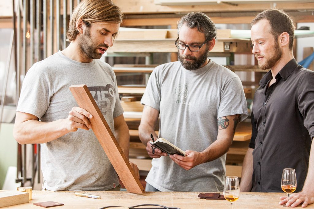 In Hamburg traf feinster Single Malt auf raue Hanseaten: Lasse Bagdahn und Per Völkel von der Holzmanufaktur Hafenholz leisteten mit einer aus Mahagoni-Resthölzern bestehenden und edel gestalteten Barkarte mit Drink-Rezepten ihren Beitrag zur Erweiterung der 5 Crafts Collection. Dabei stand das Team der Bar Berglund, in der die 5 Crafts Tour in Hamburg zu Gast war, fachmännisch zur Seite. Auch der Tresen der Bar Berglund wurde von den beiden Handwerkskünstlern in aufwendiger Handarbeit aus recyceltem Mahagoni hergestellt.