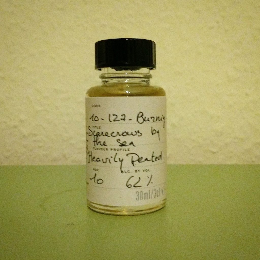 Vor einigen Tagen kam ein Päckchen aus Edinburgh mit einem Sample der Scotch Malt Whisky Society bei mir an. Der Name Burning Scarecrows by the Sea (dt.: brennende Vogelscheuchen am Meer) lässt schon auf ein eher rauchiges Erlebnis schließen. Hinter dem Bottle Code 10 verbirgt sich die Destillerie Bunnahabhain von der Isle of Islay und der Hinweis „Heavily Peated“ auf dem Etikett des Samples beseitigt dann restliche Zweifel.