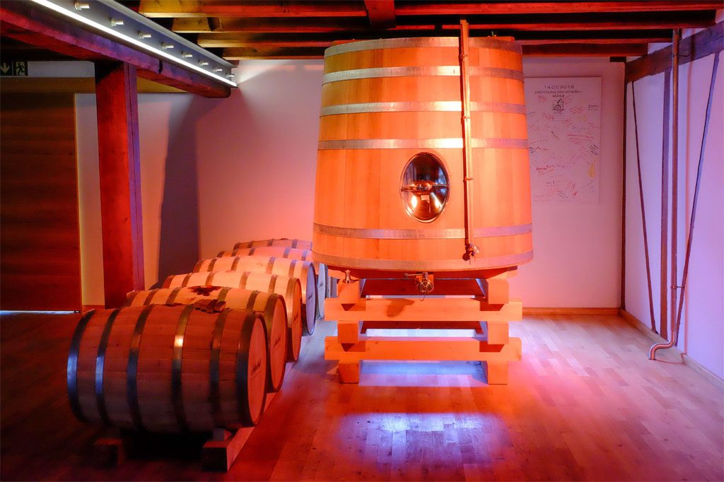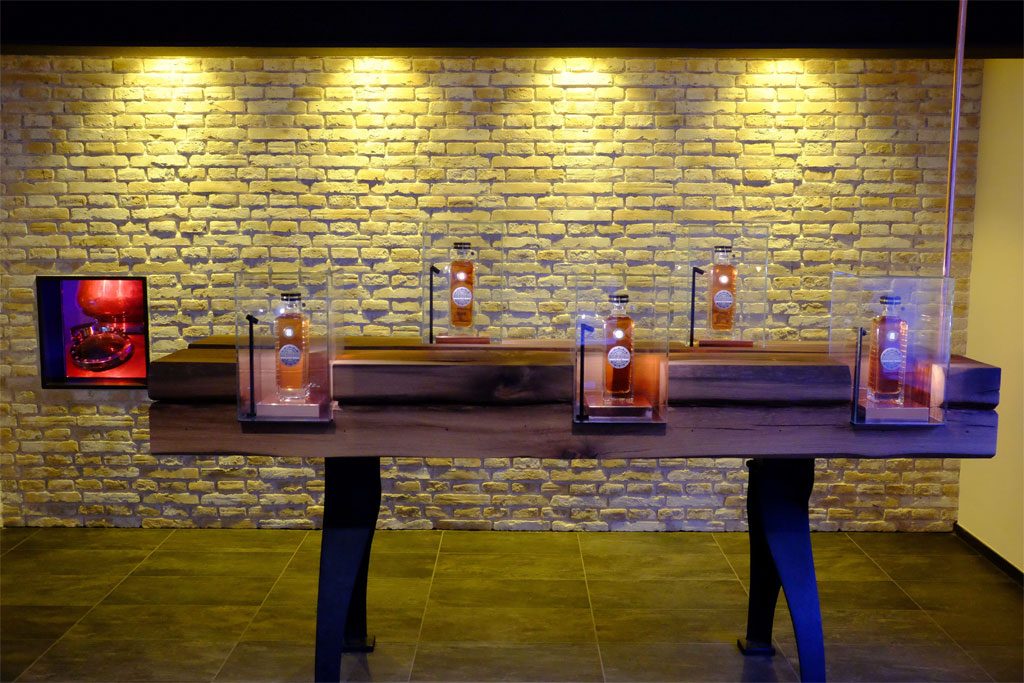 Die vier Etagen des Gebäudes wurden zum Teil mit Böden aus Metallgittern versehen, so dass sich im gesamten Gebäude ein Kamin-Effekt ergibt, ähnlich wie in den Bourbon-Warehouses in den USA. Unten strömt kalte Luft ein, erwärmt sich und steigt nach oben, wodurch im gesamten Gebäude ein Luftzug entsteht. Dieser zieht die Feuchtigkeit aus dem Fass und sorgt zusammen mit dem Temperatur-Gefälle für eine schnellere Reifung. Unter dem Dach gibt es dabei die größte Temperatur-Differenz – von um die null Grad im Winter bis zu rund 45 Grad im Sommer. Die Fässer in diesem Bereich reifen daher auch am schnellsten. Die aktuellen Abfüllungen sind Cuvées aus vier verschiedenen Fässern und da es auch vier verschiedene „Klimazonen“ gibt lässt sich damit gut spielen.