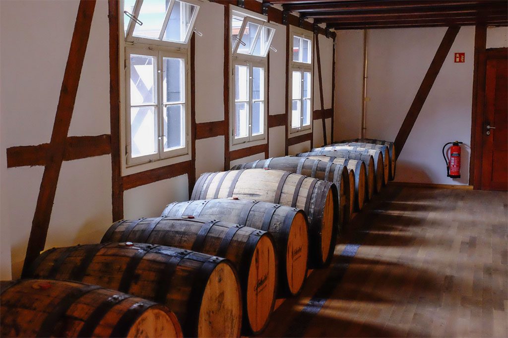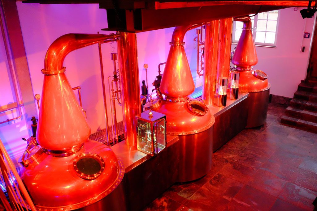 Die erste Überraschung beginnt gleich im Erdgeschoss. Dort stehen drei Brennblasen, die bis auf die Größe sehr den schottischen Pot Stills ähneln. Das ist bei weitem nicht in jeder deutschen Brennerei so, ganz im Gegenteil. Meistens wird auf Kolonnenanlagen gebrannt, bei denen mehrere Kammern im Hals oder in einer separaten Kolonne das Destillat in einem Brennvorgang mehrfach brennen und das meistens auch noch auf einen viel zu hohen Alkoholgehalt. Auch wenn das Destillat nur zu einem Drittel zum späteren Geschmack beiträgt, so ist es doch die Grundlage für die Reifung im Fass. Und wenn diese Grundlage schon nicht stimmt, dann kann auch mit der besten Reifung nichts dabei herauskommen.