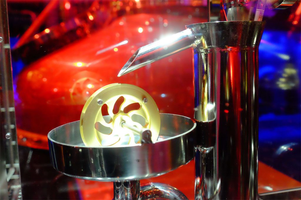 Die beiden Brennblasen rechts sind die Wash Stills, in denen die Maische den ersten Brenndurchgang durchläuft. Nach einer Ruhephase wird der erste Brand dann auf der linken Sprit Still auf die endgültige Stärke gebracht. Der Hals ist dabei leicht aufsteigend so angeordnet, dass sich die ideale Stärke ergibt und das Destillat ohne Verdünnung und nach einer weiteren Ruhephase direkt in die Fässer gefüllt werden kann. Alle drei Brennblasen haben rund 1000 Liter Fassungsvermögen. Besonders schön finde ich als kleines Detail das Mühlrad, über das das Destillat in den Spirit Safe läuft.
