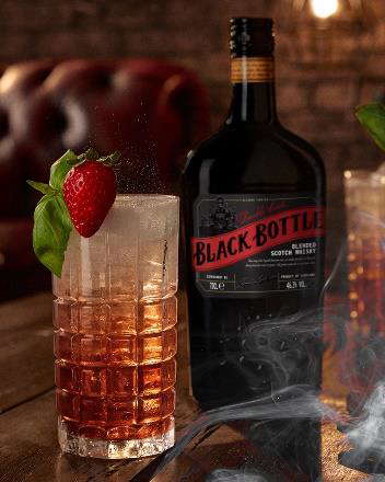 50 ml Black Bottle Double Cask, 10 ml Dry Vermouth, Frische Erdbeeren, Soda, Eiswürfel.