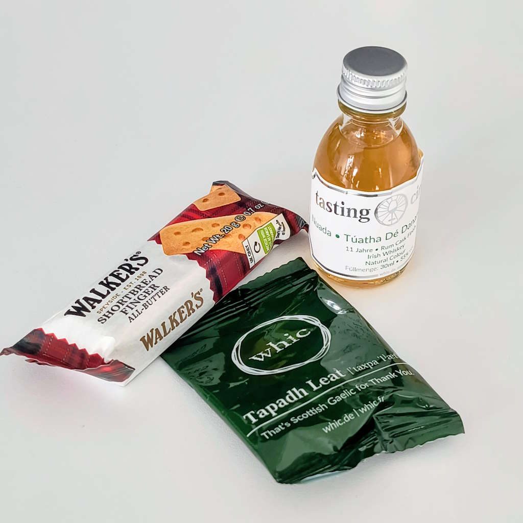 Von whic hatte ich vorab ein Sample des Nuada erhälten, zusammen mit einer Tüte Fruchtgummi und einem Shortbread von Walkers.