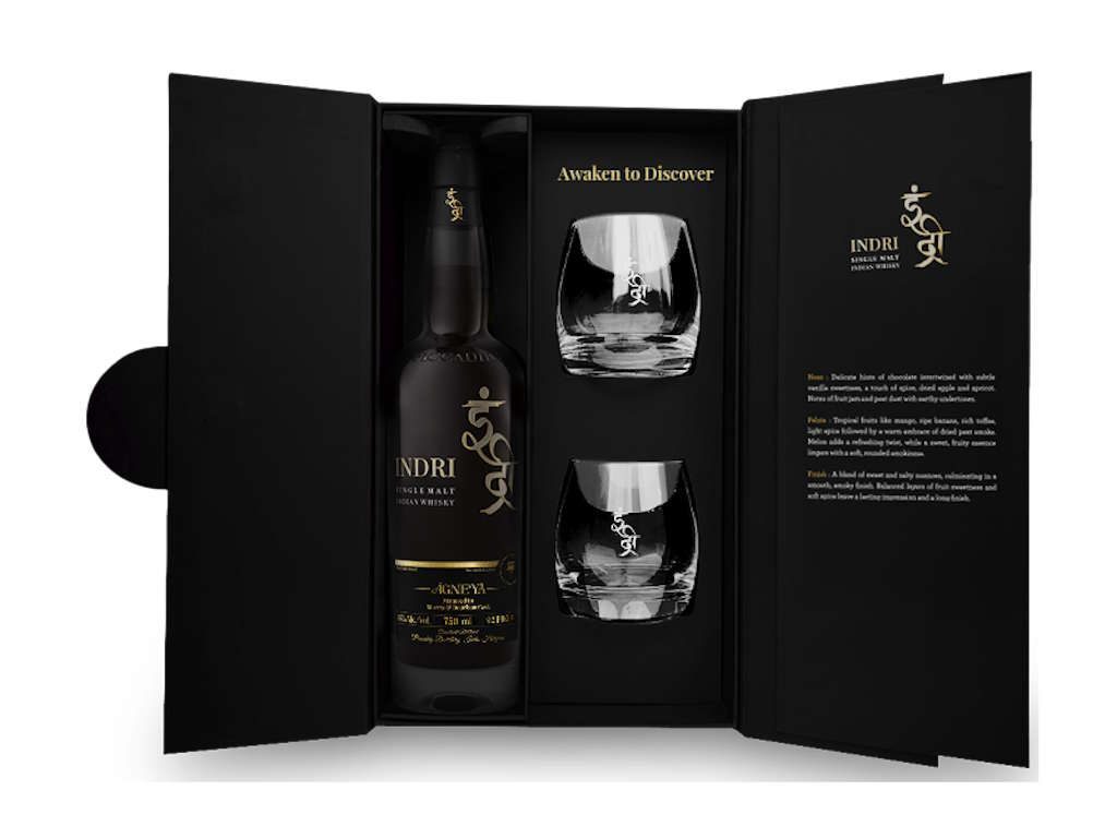 Der Indri Agneya ist ein getorfeter Single Malt Whisky, der durch seine ausgewogene Kombination aus Rauch und Frucht besticht. Die Geschenkpackung inklusive zwei Gläsern macht ihn zu einem idealen Präsent für Whisky-Enthusiasten.